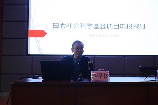 李学林教授以“国家社会科学基金项目申报探讨”为题,结合其三个国家社科基金项目申报经验,以