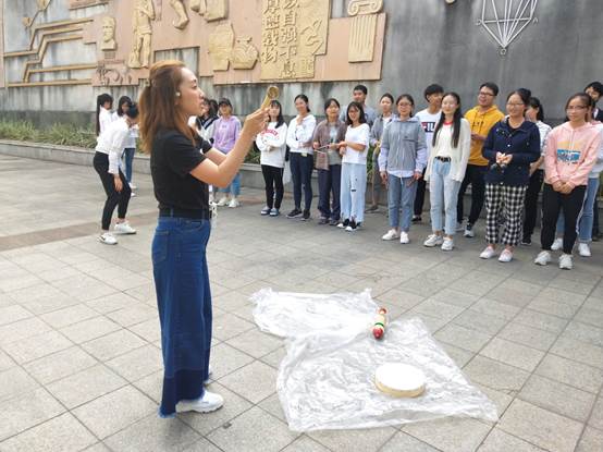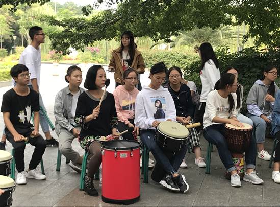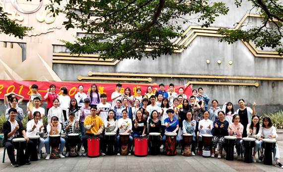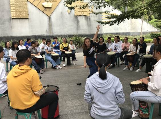 最后,何老师说:“鼓圈能够舒缓你的情绪,放松身心,同时澎湃的声音也能够宣泄心中的情感。当大家心情不好时,可以做像鼓圈这样的活动来排除烦闷。比如,回寝室后,敲打你的脸盆,也可以宣泄情绪哦。”