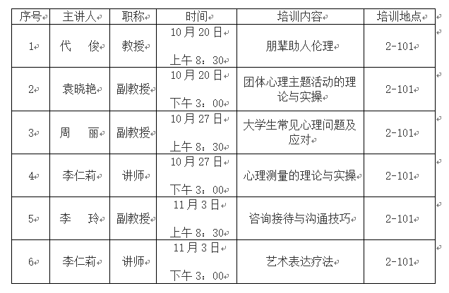 为了能在老员工心理协会新成员及心理部干事中选拔部分优秀成员成为朋辈咨询员,以协助心理健康教育中心的工作,特进行专业心理知识系列讲座,具体安排如下: