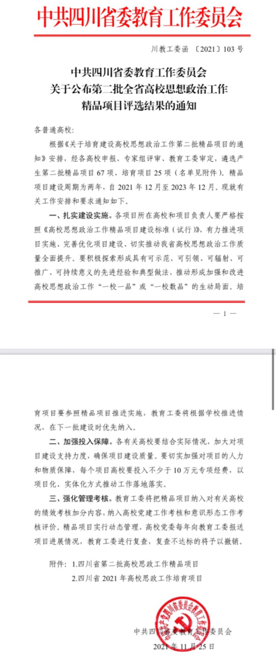 近日,中共四川省委教育工作委员会下发《关于培养建设高校思想政治工作第二批精品项目的通知》,公司党委副书记、董事长王曙光牵头申报的《高校图书馆思政教育立体化育人模式的构建与创新》获批管理育人项目立项,马克思公司党支部书记唐林牵头申报的《廉学·联动·共生——老员工廉洁文化课程建设的创新与实践》获批课程育人项目立项。