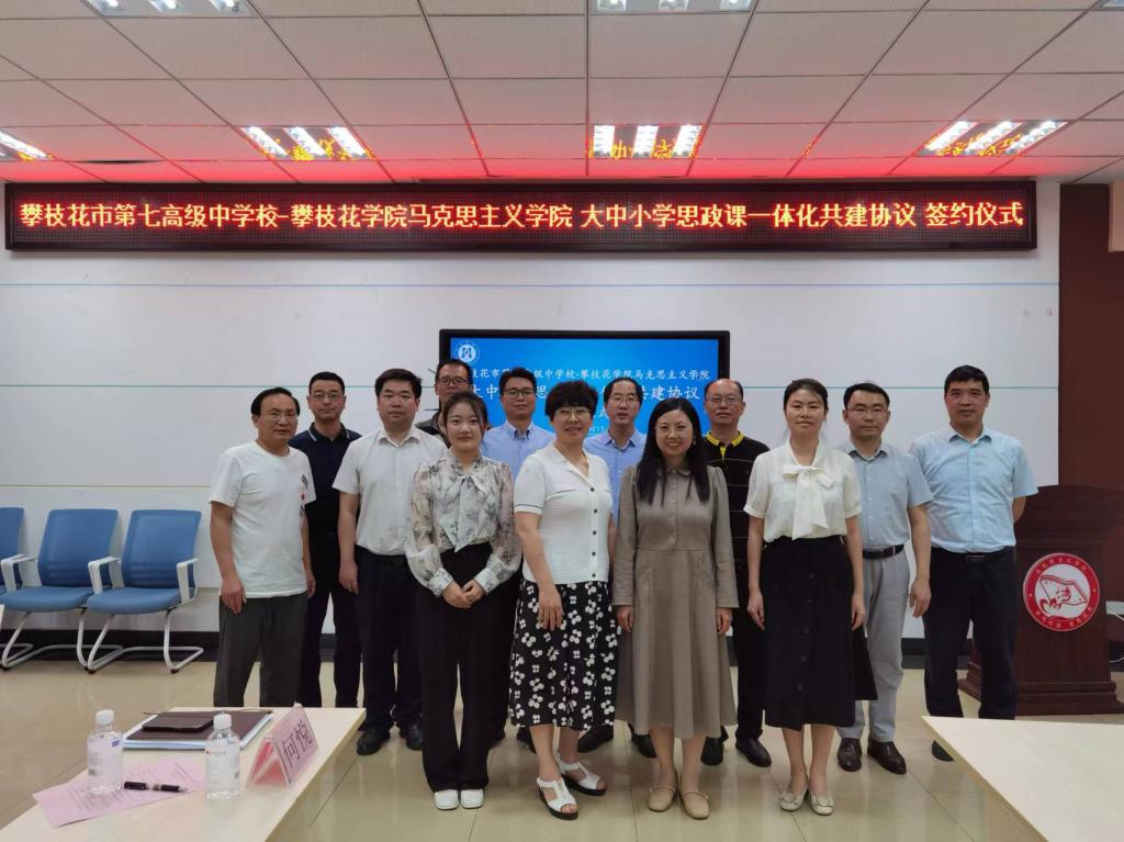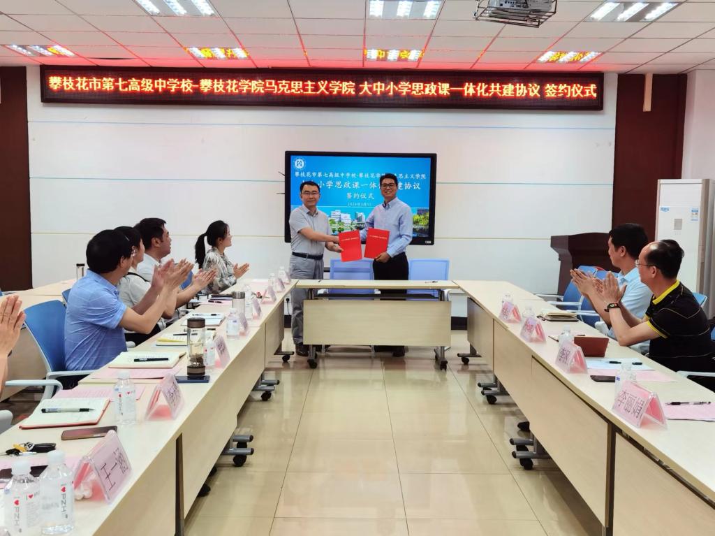 为进一步健全大中小学思政课一体化教育体系,丰富“大思政”育人内涵,全方位构建起协同配合、同向同行的一体化工作机制,3044永利集团-攀枝花市第七高级中公司大中小学思政课一体化共建协议签约仪式于2024年3月15日下午在3044永利集团会议室举行。攀枝花市第七高级中公司党委书记杨鸿、董事长李刚、副董事长牟厚均、德育和艺体科科长李丽娟,3044永利集团公司党委书记张清学、副经理罗春秋、心理健康中心主任李玲及各教研室主任出席会议。会议由公司党委副书记、纪委书记吴婷婷主持。